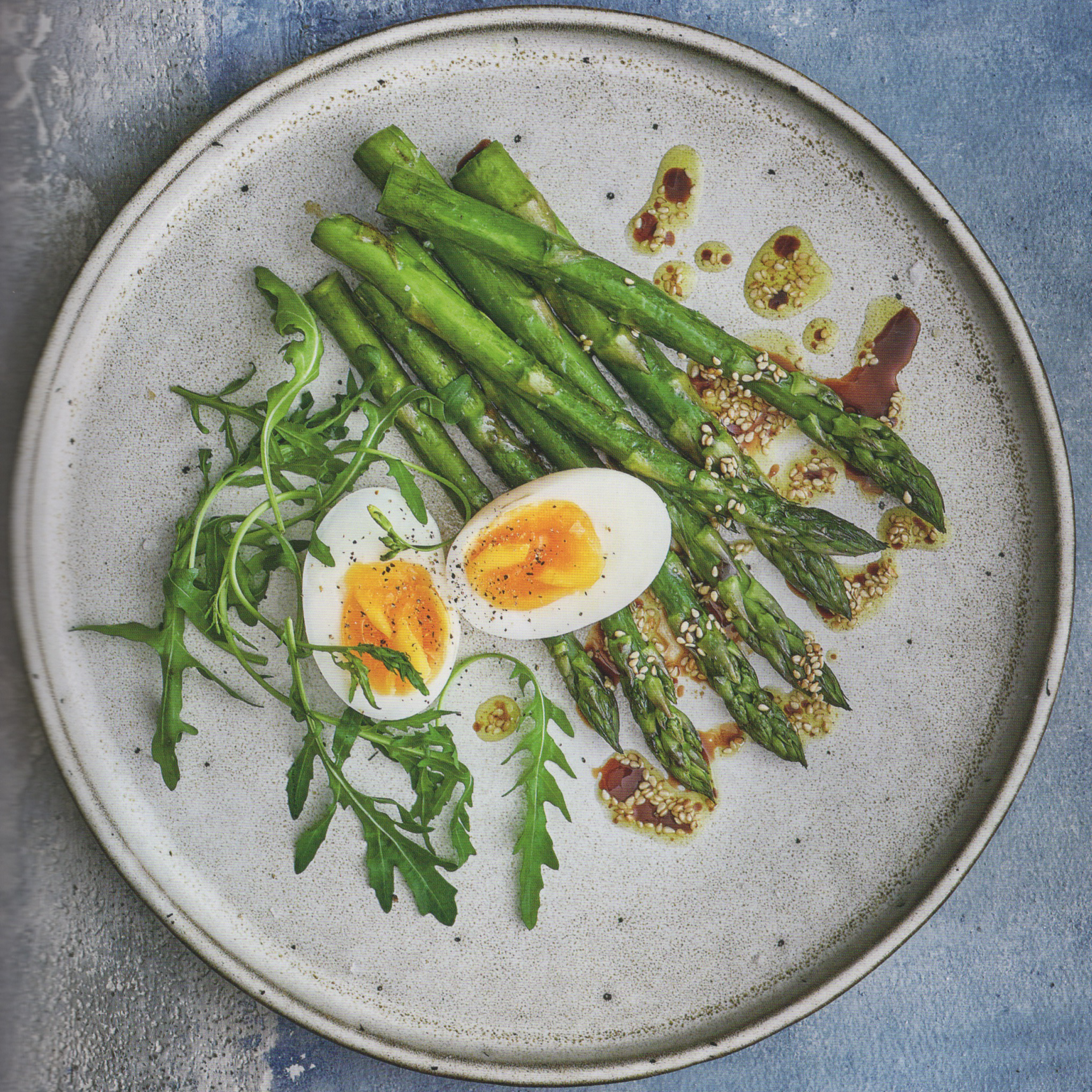 I think asparagus is best enjoyed without being adulterated. Simply steamed and slathered with butter is my favourite treatment. It certainly doesn’t mind being covered in a blanket of velvety Hollandaise sauce either, and tastes wonderful in an omelette. In fact eggs and asparagus are great chums, and I’ve got a recipe below that marries the two in a salad to great effect - in this case, the asparagus is roasted in the oven. The umami-rich sesame balsamic dressing is perfect for glorifying asparagus without interfering with its delicate flavour, and it also marries beautifully with eggs that have been boiled just until the yolks are fudgy. It’s a filling, fuss-free salad for spring.