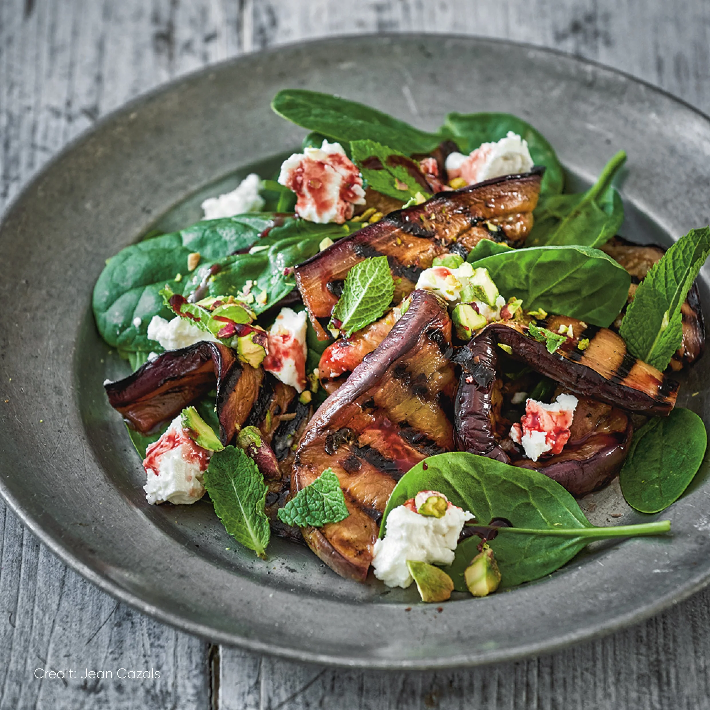 4) Make a bed of young spinach leaves on each plate and pile the aubergines on top. Scatter the cheese over them. Drizzle with pomegranate molasses, sprinkle with chopped mint and pistachios and serve.