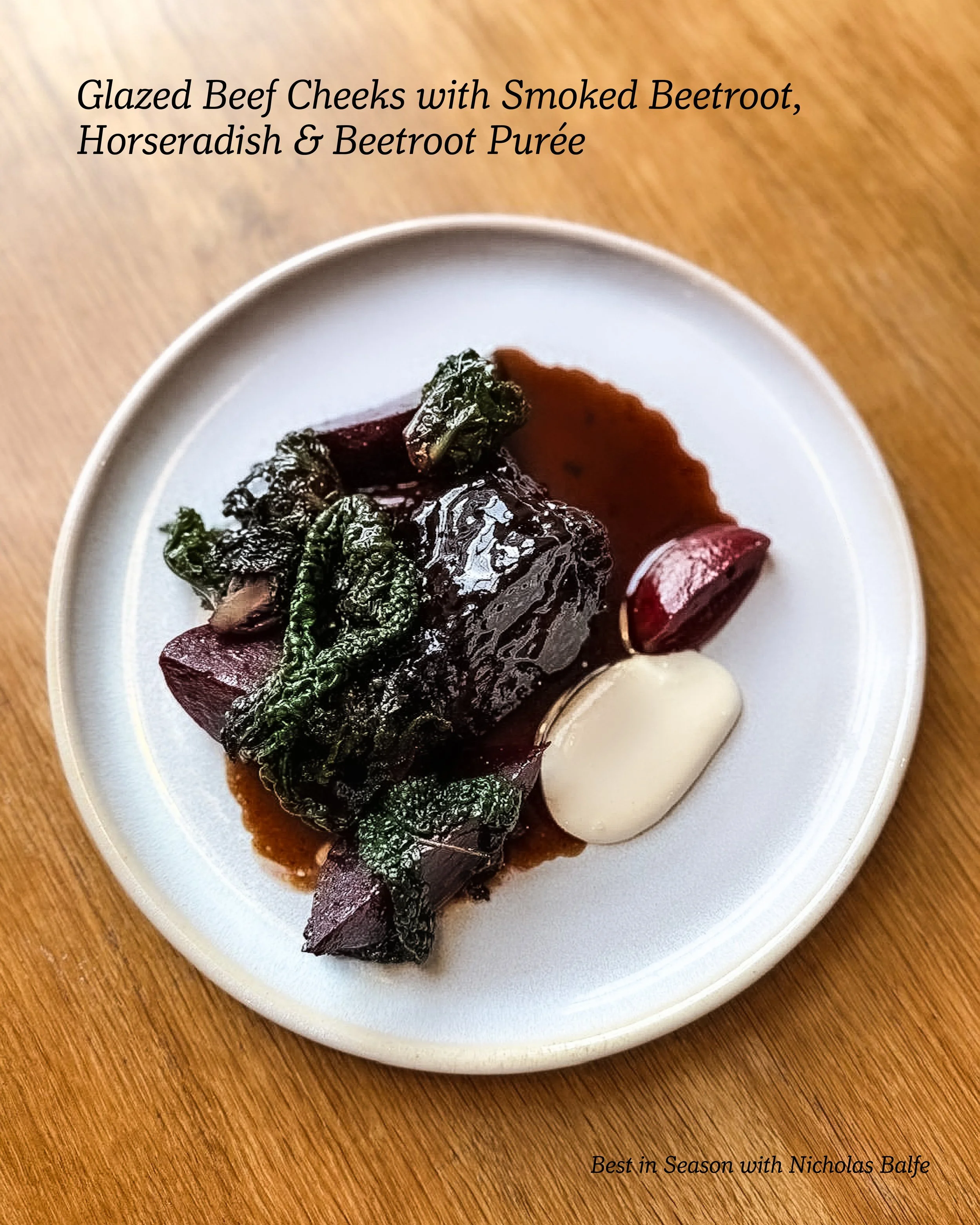 Glazed Beef Cheeks with Smoked Beetroot, Horseradish & Beetroot Purée