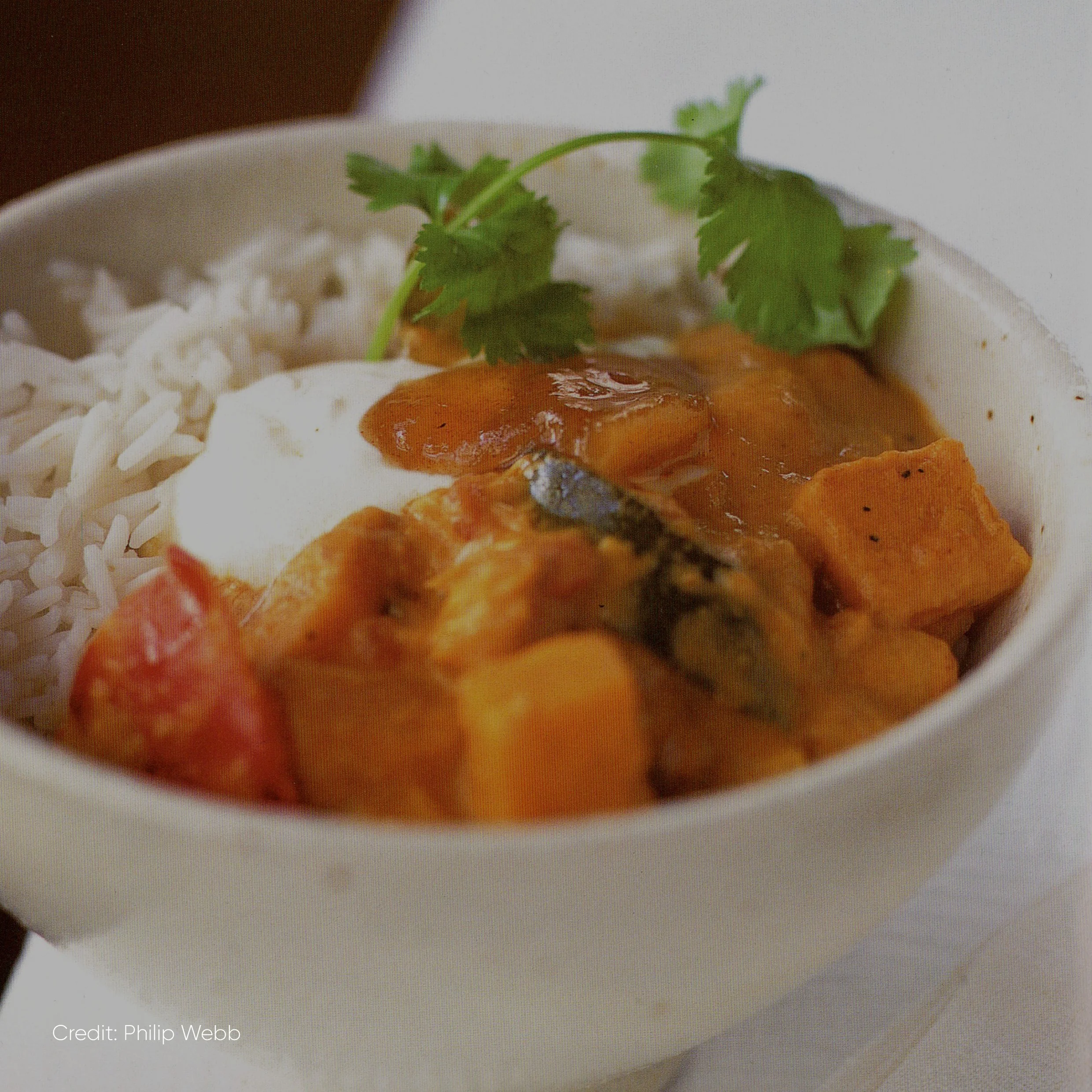 4) Heat the oil in a large, heavy-based saucepan, add the onion, and cook until softened. Add the spice paste and stir for 2 minutes to release the aromas, then add the pepper, sweet potatoes, courgettes, and chickpeas. Cover and cook, stirring occasionally, for 10 minutes. Add the tomatoes and 250ml water, then bring to a boil and simmer, uncovered, for about 20 minutes.